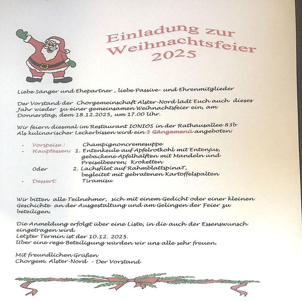 ich weiß nicht, welchen Sängern ich die Einladung zur Weihnachtsfeier bereits in Papierform ausgehändigt habe, deswegen hier nochmals auf dem elektronischen Wege.